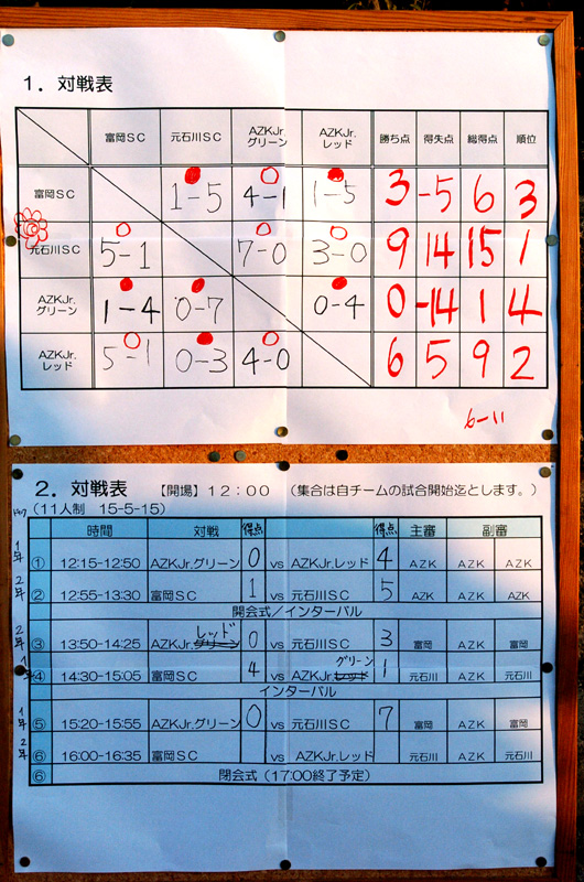 お疲れ様でした。 SL1年生のみんな優勝おめでとう! 対戦結果 ①AZKJr グリーン 0-4 AZKJr レッド ②富岡SC 1-5 元石川SC ③AZKJr レッド 0-3 元石川SC ④富岡SC 4-1 AZKJr グリーン ⑤AZKJr グリーン 0-7 元石川SC ⑥富岡SC 1-5 AZKJr レッド AZKは2年はベストメンバーではなかったですが、2年生相手に頑張りました。 ケイゴやりましたよ!